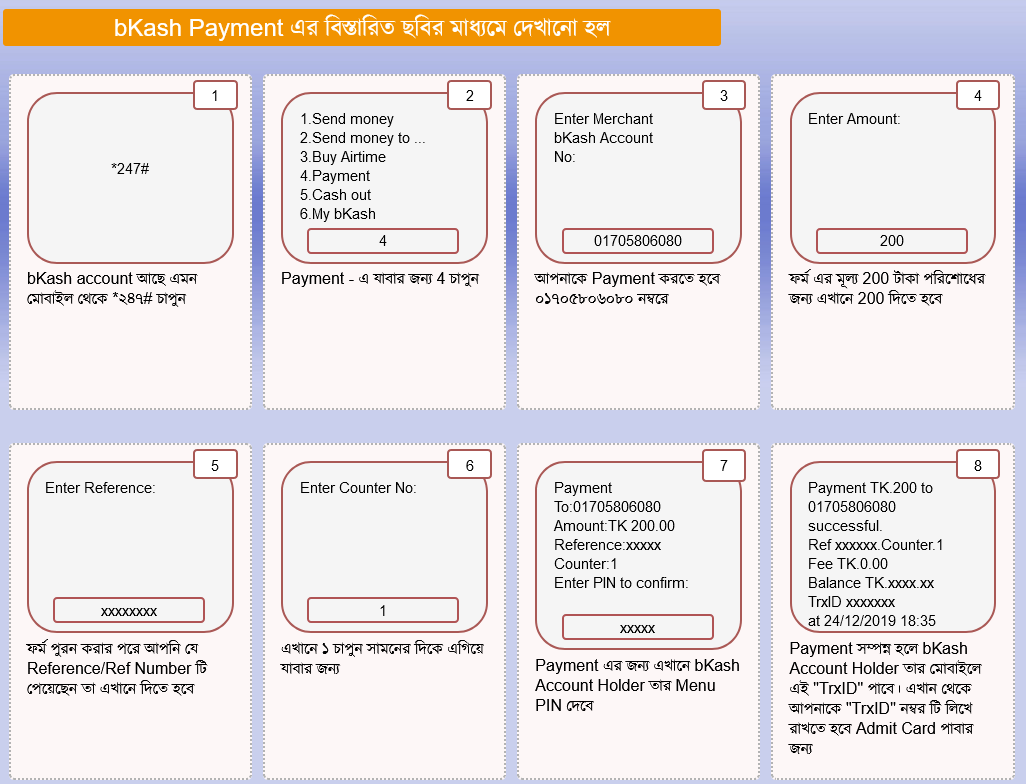bKash এ সফল ভাবে টাকা জমা হলে আপনি একটি TrxID Number নাম্বার পাবেন। TrxID নাম্বারটি আপনাকে অবশ্যই লিখে/মনে রাখতে হবে। পরবর্তীতে Admit Card উত্তলনের জন্য এই TrxID নাম্বারটি প্রয়োজন হবে।
